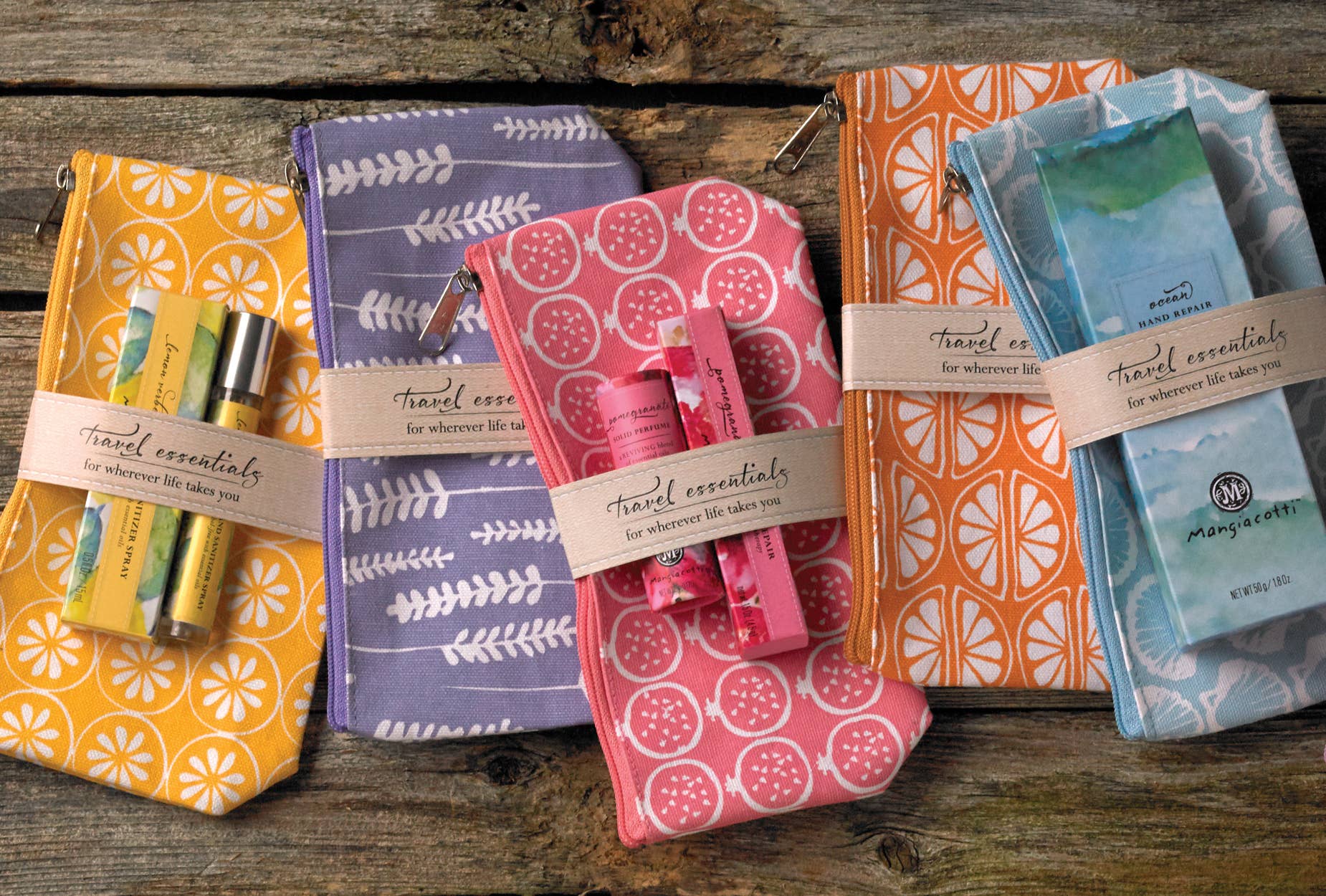 These sturdy canvas cosmetic bags will fit all of your travel needs. Use them with our hand repair, hand sanitizer spray and mini lip repair to make the perfect gift.