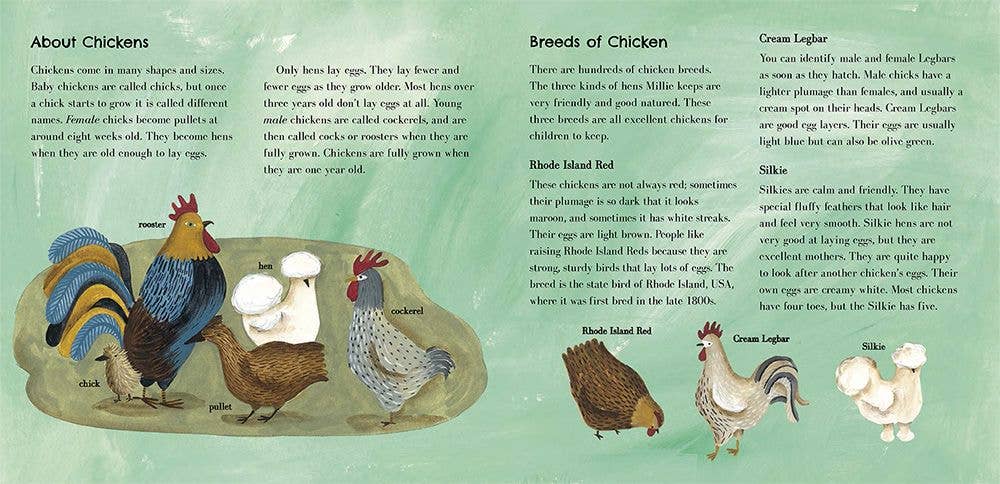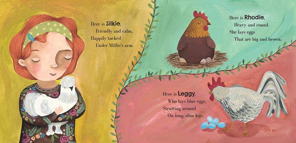 Watch Millie care for her suburban backyard chickens in this playful rhyming story. Then, delve into 7 pages of educational endnotes to learn all about chickens, including anatomy and breeds, and 4 easy egg dishes to try together! A fun way to introduce kids to life sciences and where food comes from.